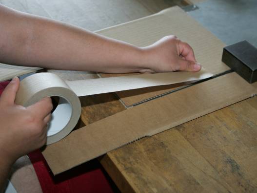Wir stellen für unsere Kunden Verpackungen aus Pappe her. Das sind oft neue Formen. Dabei schneiden, falten und kleben wir.