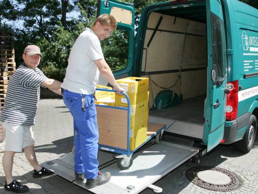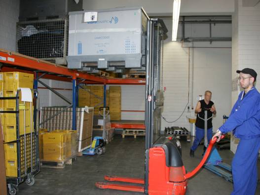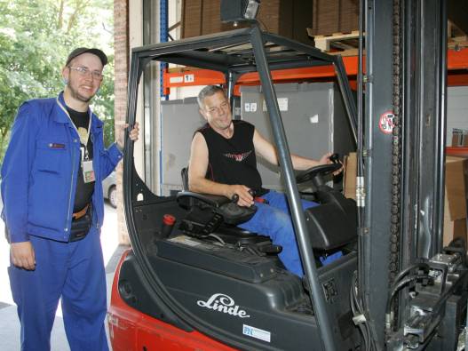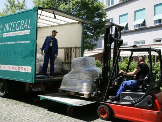 Im Lager stehen alle Materialien, die in der Werkstatt verarbeitet werden. Mit Hubwagen werden sie in die Arbeitsgruppen gebracht. Die fertigen Produkte werden im Lager versandfertig gemacht und mit einem Gabelstapler auf die LKW verladen.